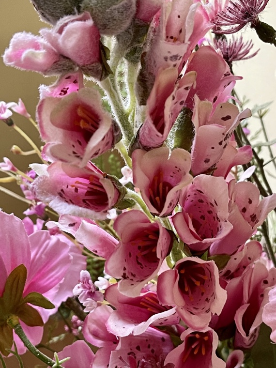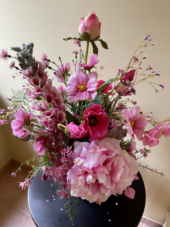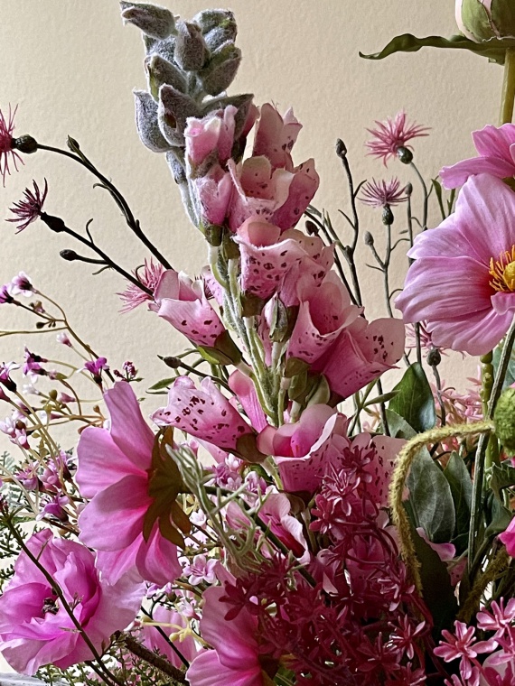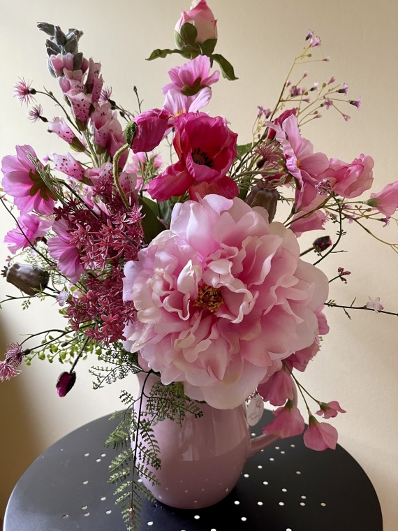 Bauernrosen, Fingerhut, Cosmea, Mohn und vieles mehr in einem zart rosé farbigen Keramik Krug.