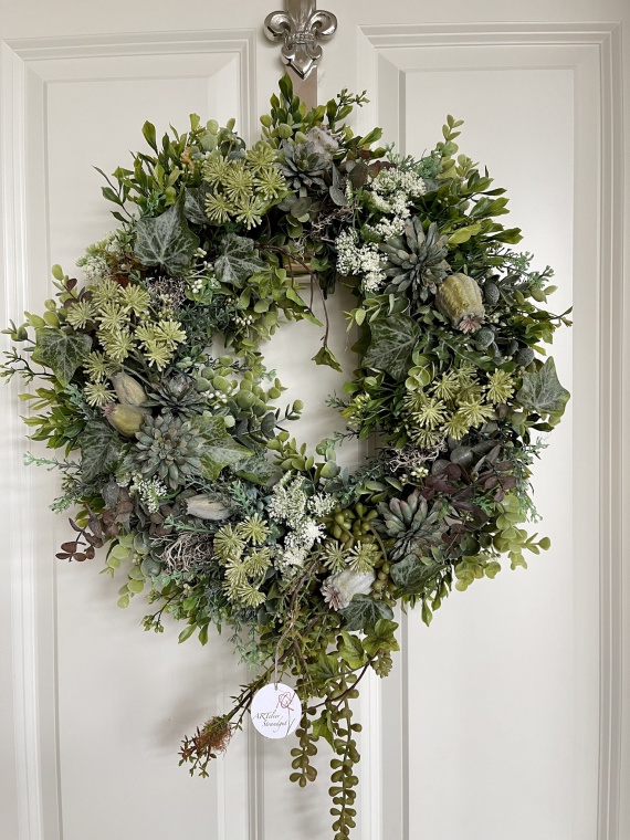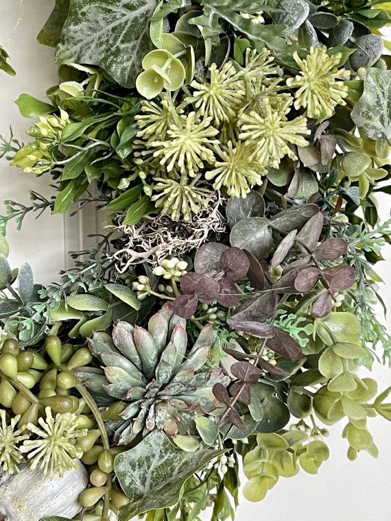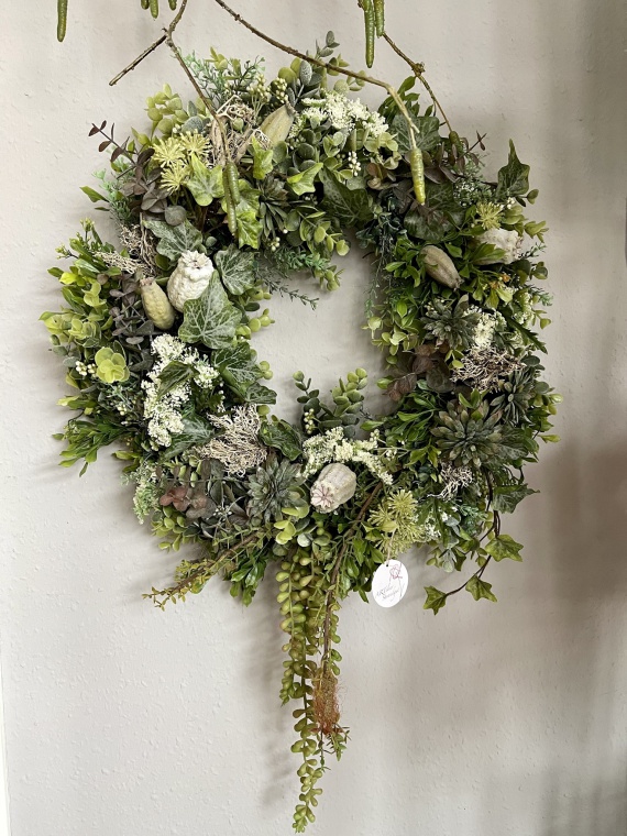 Zeitlos | Wand und Tür Kranz, Eukalyptus, Buchsbaum, Efeu und Sukkulenten in verschiedenen Grüntönen verzaubern jede Tür und Wand.