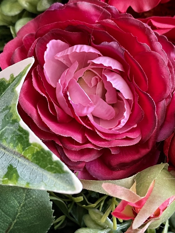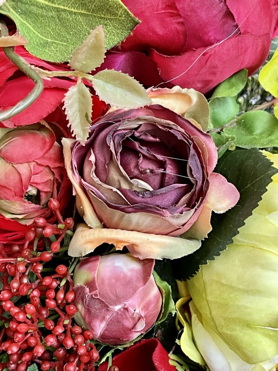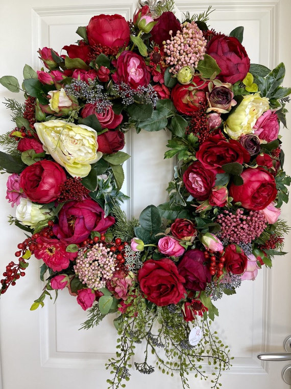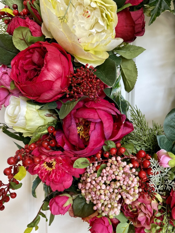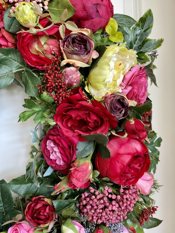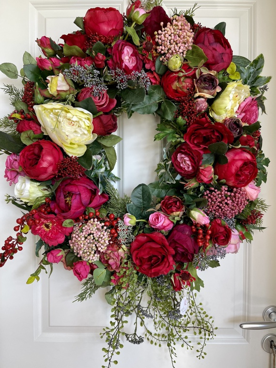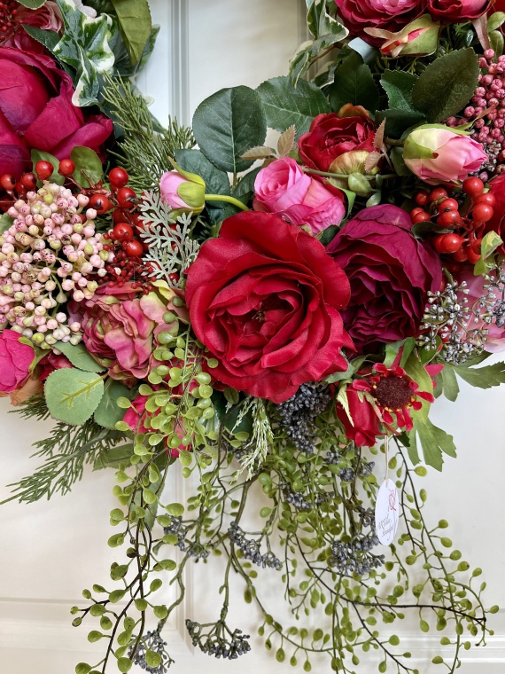 Pure Rose | Opulenter Wandkranz in den Farben rot, grün-rosé in einer verschwenderischen Verarbeitung von Rosen und Zubehör.