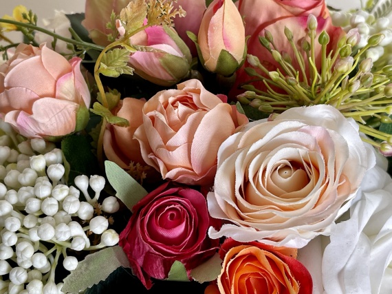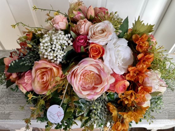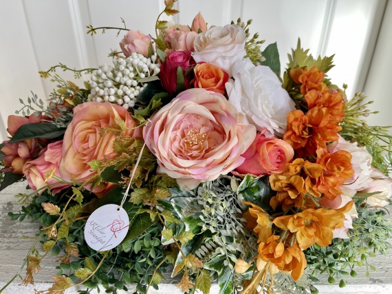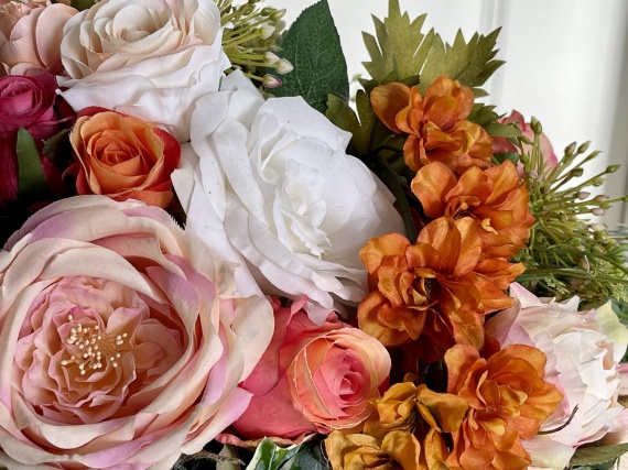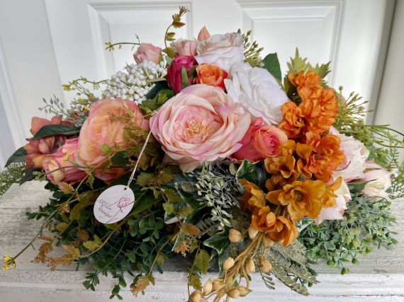 La Vida | Blumengesteck farblich abgestimmt als Aufleger für alle Wohn,- und Geschäftsbereiche. Warme Farbtöne rosé, orange und creme vermitteln ein angenehmes Sommerfeeling.