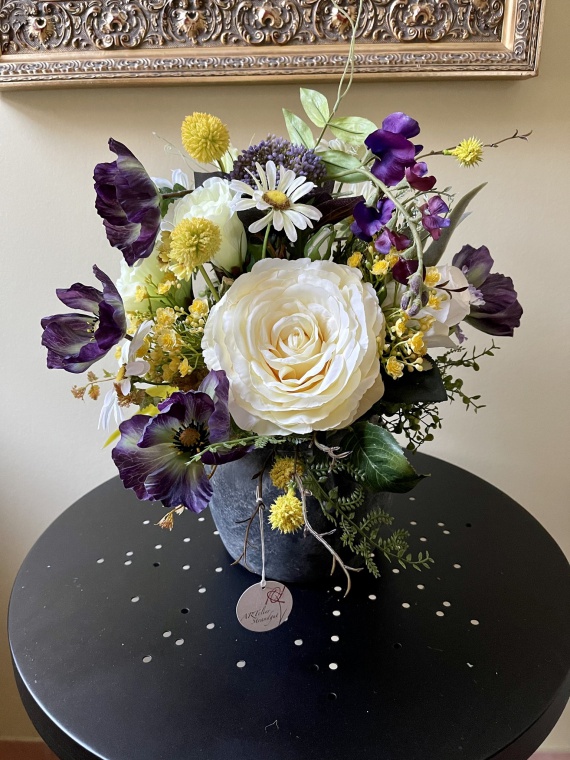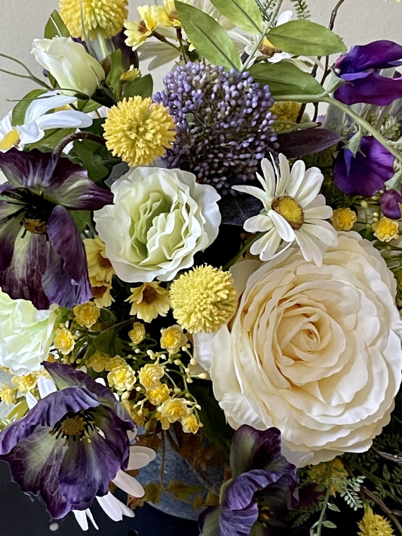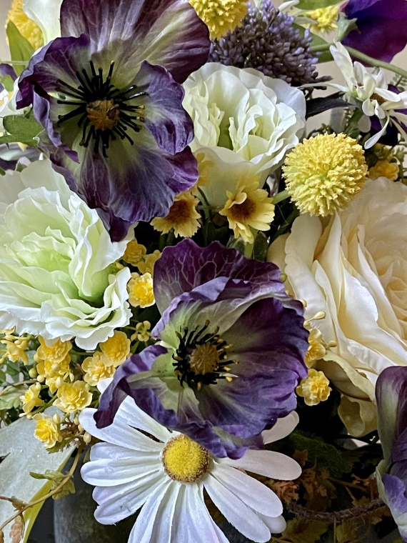im Keramikgefäß grau, exklusive Blumenmischung aus Rosen, Margeriten, Beeren, Dianthus, Mohn, Wicken und Beiwerk. In den leuchtenden Farben weiß, grün, lila und gelb.