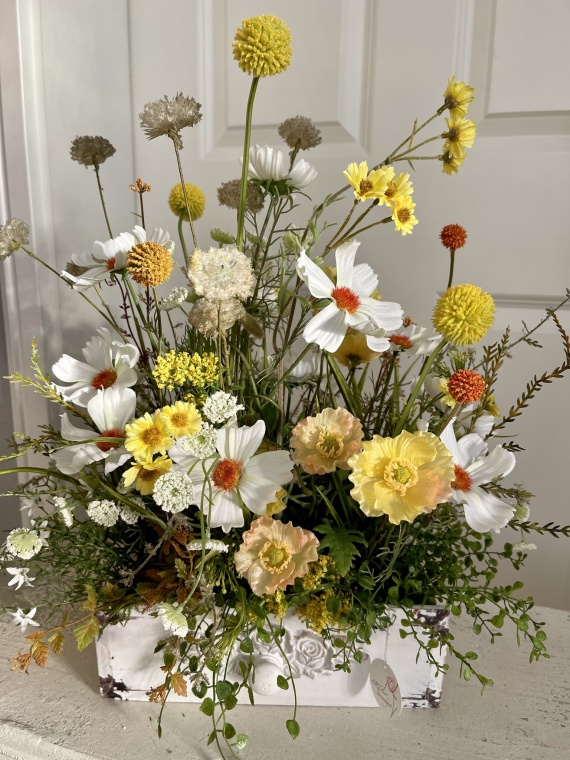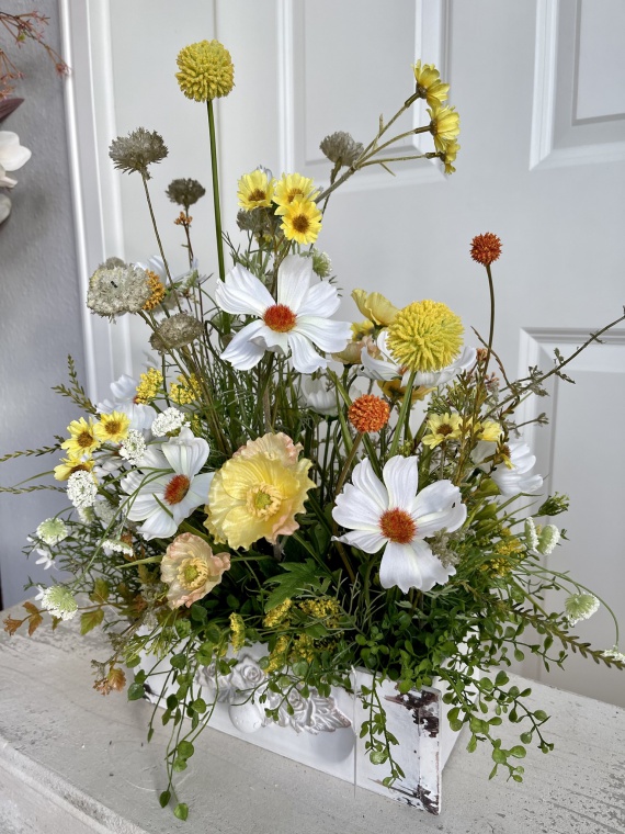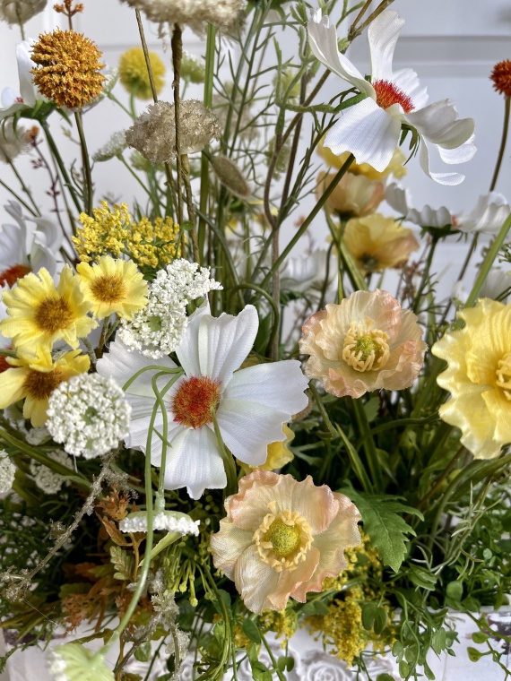 Cosmea, Mohn, Margeriten, Wildblumen, Gräser und Beiwerk, farblich abgestimmt in weiß und gelb.