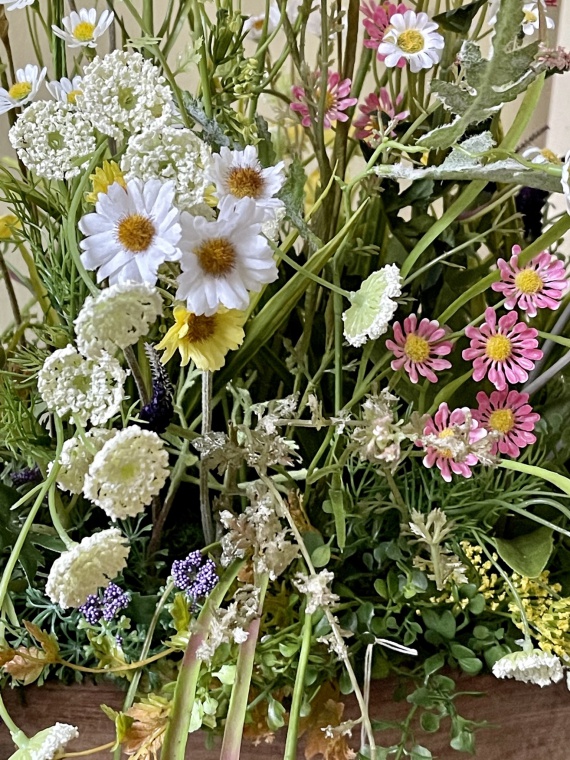 Zauberhafter alter Holzkasten mit Wiesenblumen und diversen Gräsern. Jedes Arrangement ist ein Unikat daher sind kleine Veränderungen möglich.