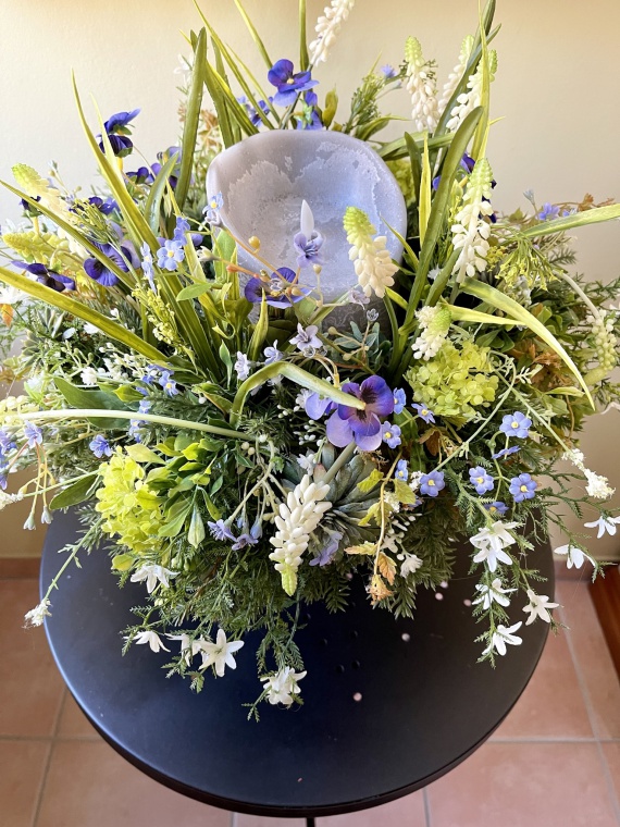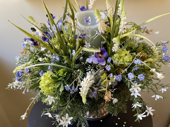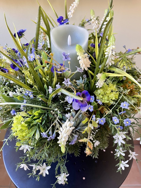 Tischkranz in den Farben blau-weiß, zarte Blüten, Hornveilchen, Traubenhyazinthen, Vergissmeinnicht und Beiwerk