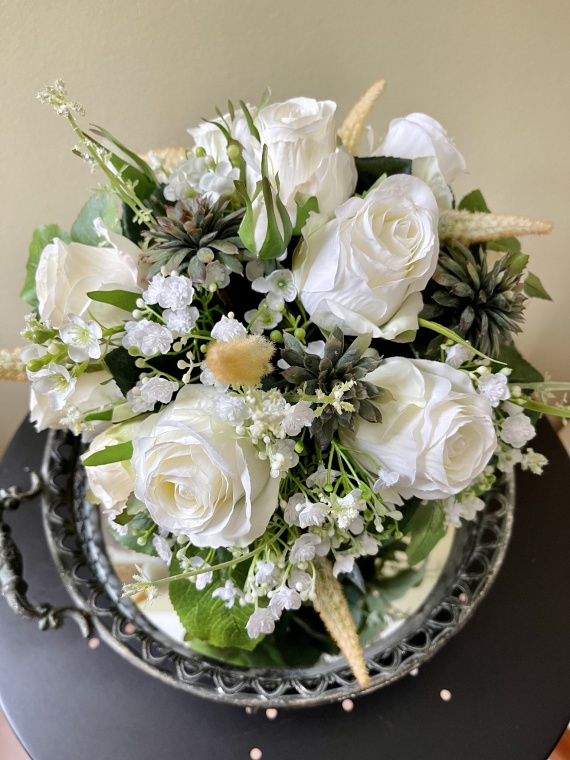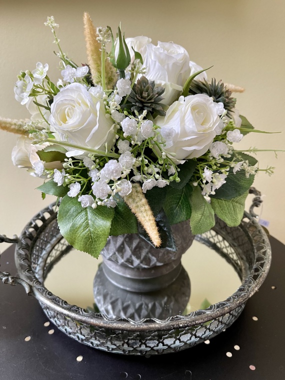 Weiße Rosen in einer zauberhaften Kombination von Ziergräsern und kleinen Sukkulenten.