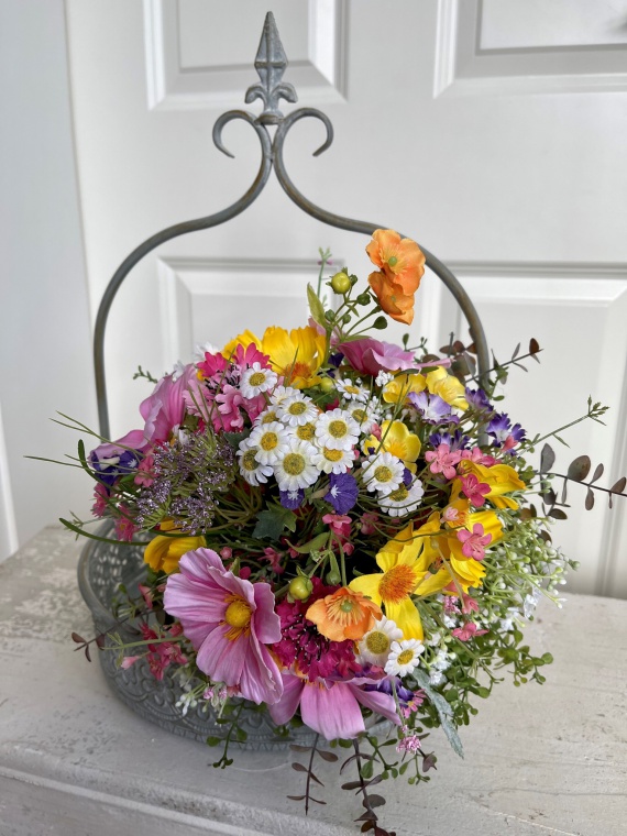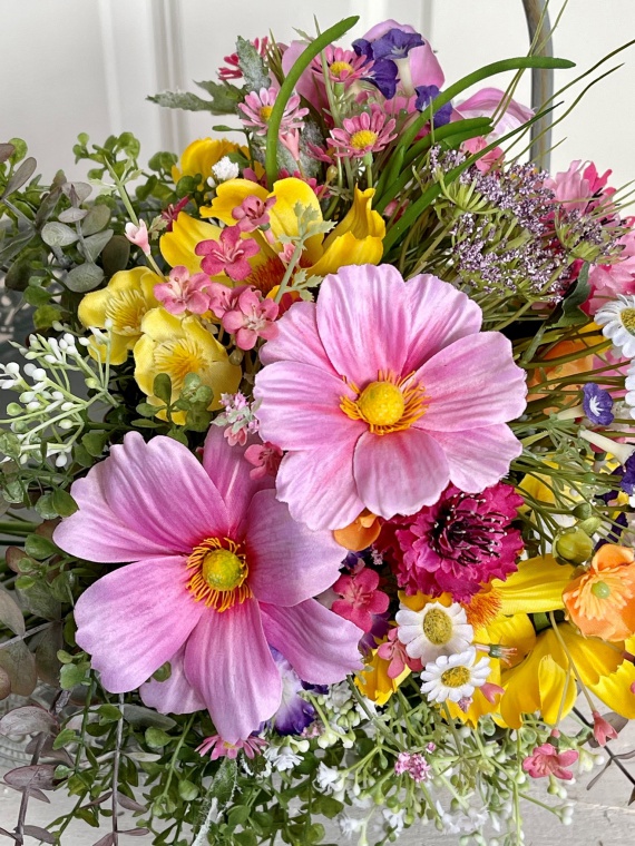 farbenfrohe Mischung aus Cosmea, Kamille, Butterblume, Gräser und Beiwerk in den Farben Rosé, gelb, pink, orange und grün