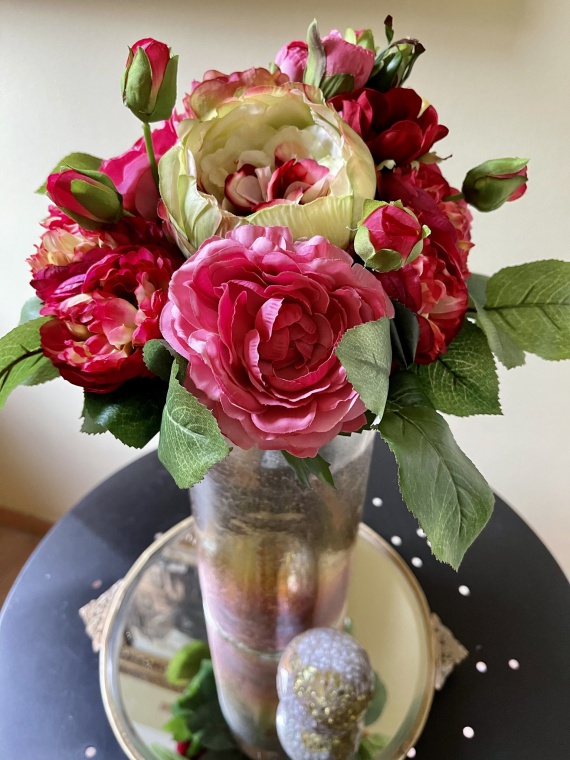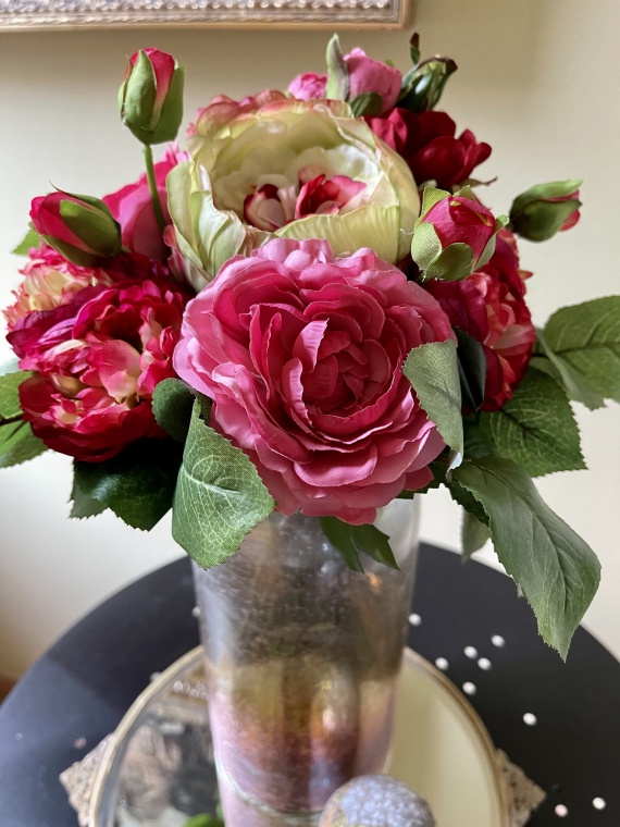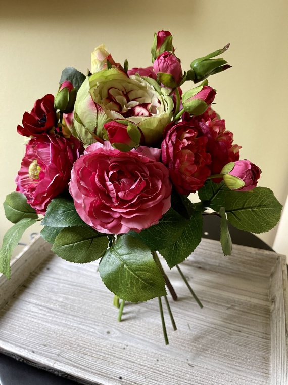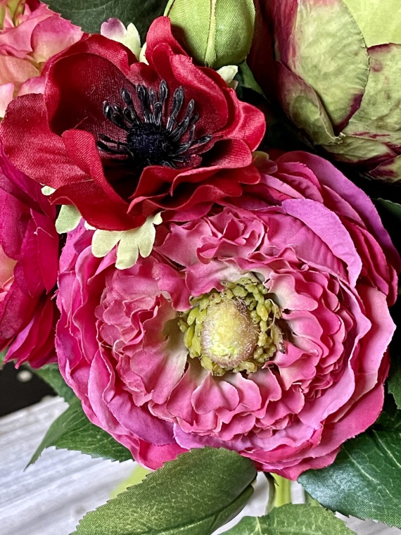 Kompakt gebundener Rosen-Ranunkel-Strauß in den leuchtenden Farben
