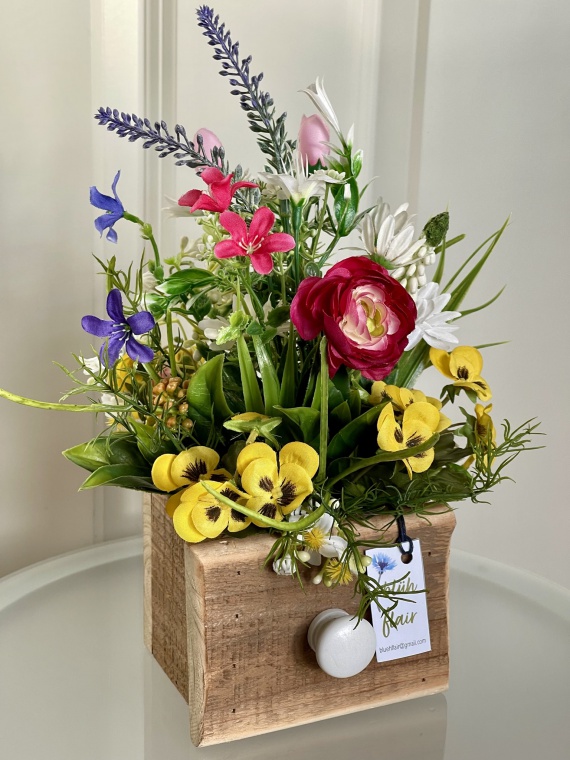 Frühlingszeit blühflair | Kleine Holzschublade mit Frühlingsblühern wie Hornveilchen, Traubenhyazinthen, Ranunkel, und Beiwerk. Bunte Farbenvielfalt in rose, gelb, weiß, blau sowie pink.