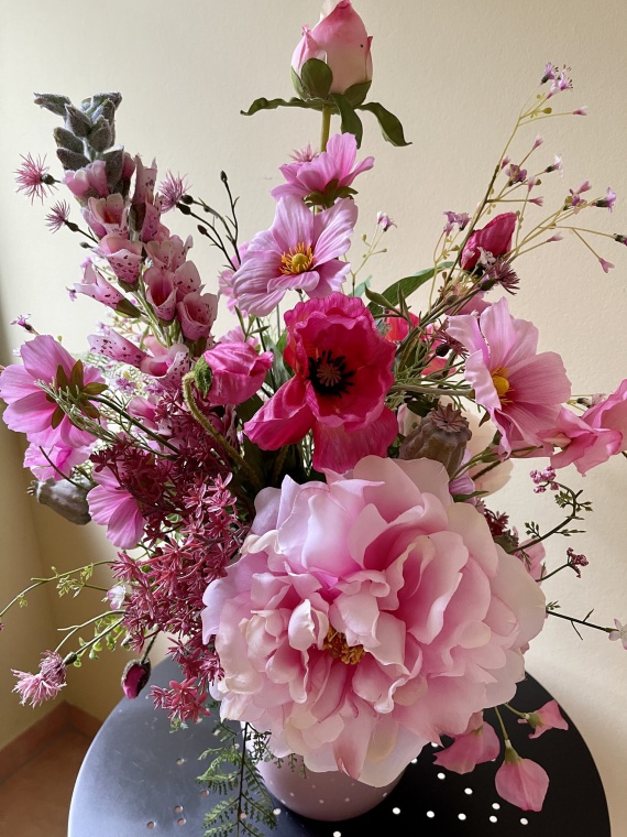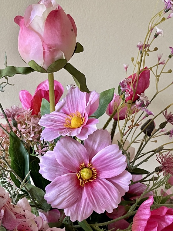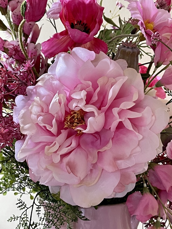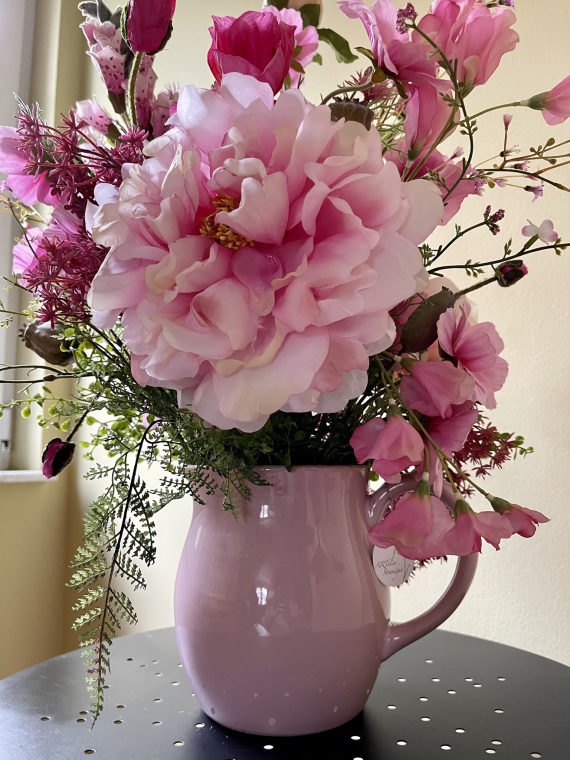 Bauernrosen, Fingerhut, Cosmea, Mohn und vieles mehr in einem zart rosé farbigen Keramik Krug.
