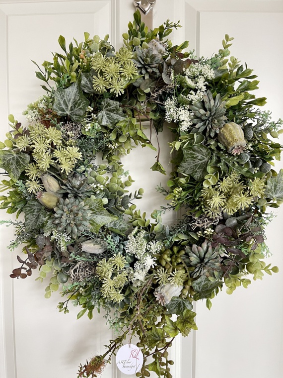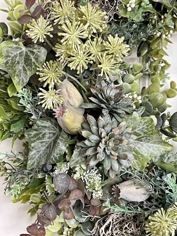 Zeitlos | Wand und Tür Kranz, Eukalyptus, Buchsbaum, Efeu und Sukkulenten in verschiedenen Grüntönen verzaubern jede Tür und Wand.