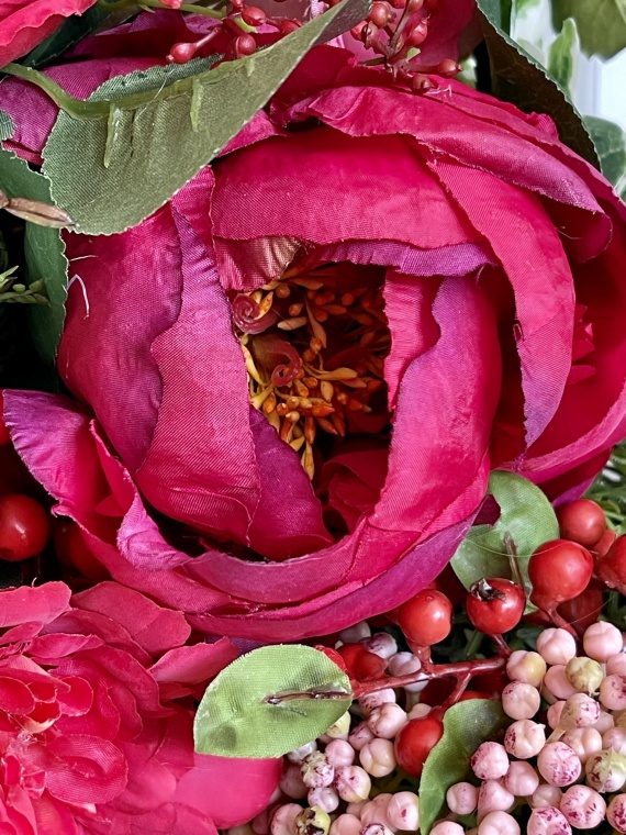 Pure Rose | Opulenter Wandkranz in den Farben rot, grün-rosé in einer verschwenderischen Verarbeitung von Rosen und Zubehör.