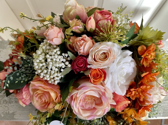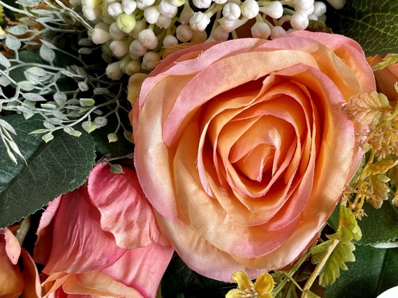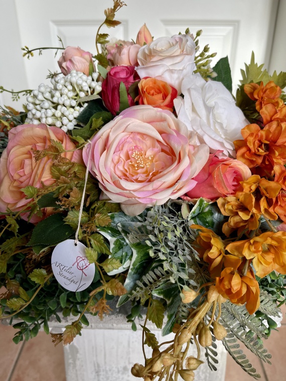 La Vida | Blumengesteck farblich abgestimmt als Aufleger für alle Wohn,- und Geschäftsbereiche. Warme Farbtöne rosé, orange und creme vermitteln ein angenehmes Sommerfeeling.