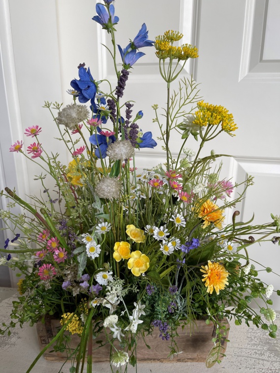 Zauberhafter alter Holzkasten mit Wiesenblumen und diversen Gräsern. Jedes Arrangement ist ein Unikat daher sind kleine Veränderungen möglich.
