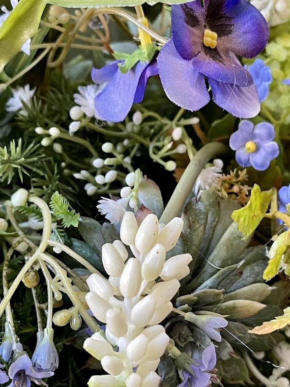 Tischkranz in den Farben blau-weiß, zarte Blüten, Hornveilchen, Traubenhyazinthen, Vergissmeinnicht und Beiwerk