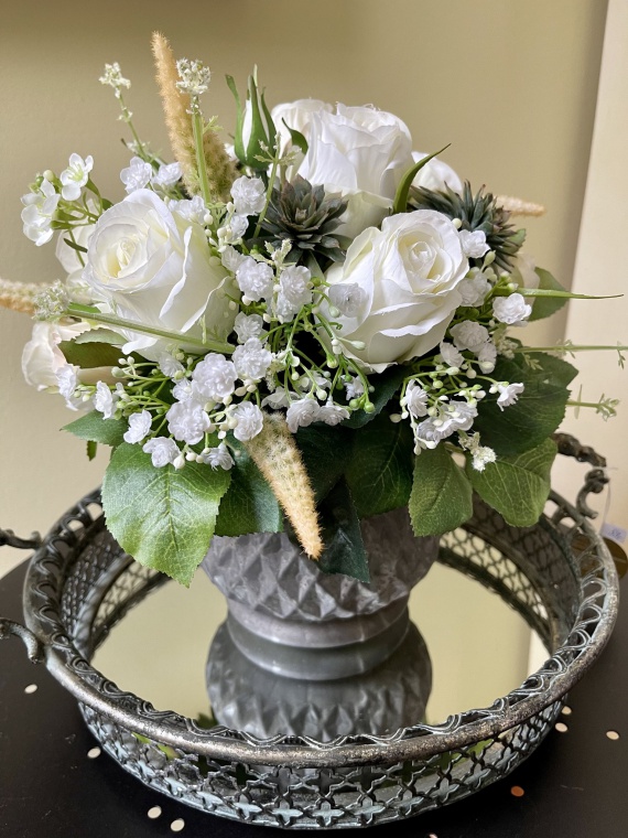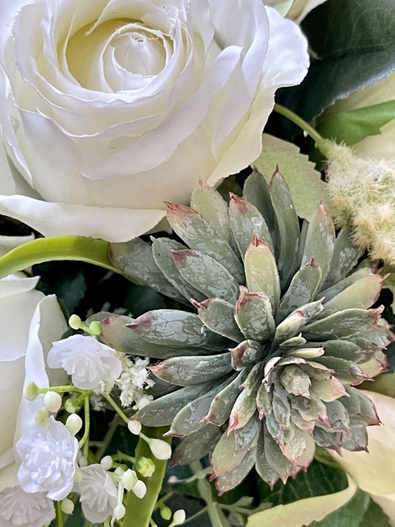 Weiße Rosen in einer zauberhaften Kombination von Ziergräsern und kleinen Sukkulenten.