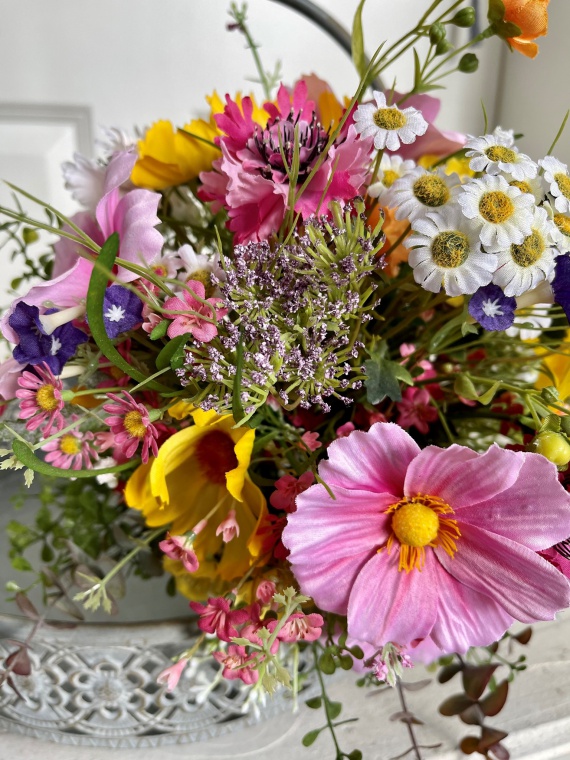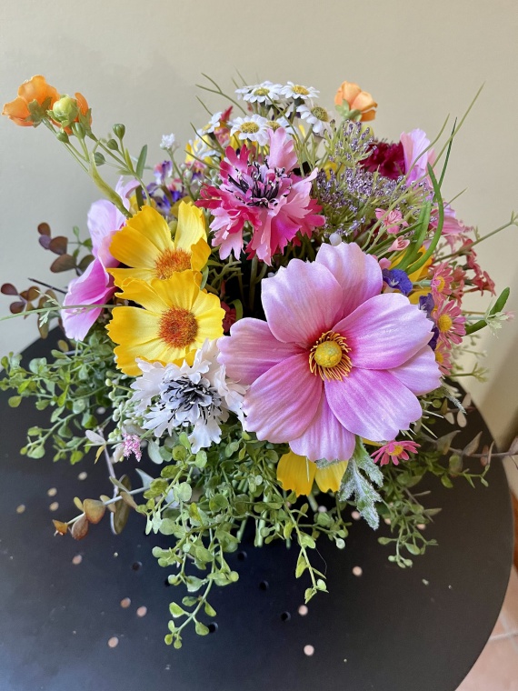 farbenfrohe Mischung aus Cosmea, Kamille, Butterblume, Gräser und Beiwerk in den Farben Rosé, gelb, pink, orange und grün