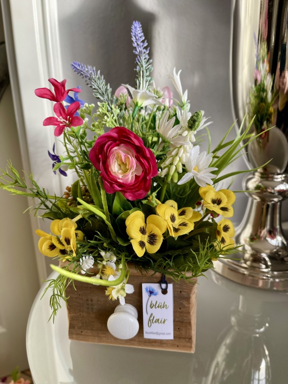 Frühlingszeit blühflair | Kleine Holzschublade mit Frühlingsblühern wie Hornveilchen, Traubenhyazinthen, Ranunkel, und Beiwerk. Bunte Farbenvielfalt in rose, gelb, weiß, blau sowie pink.